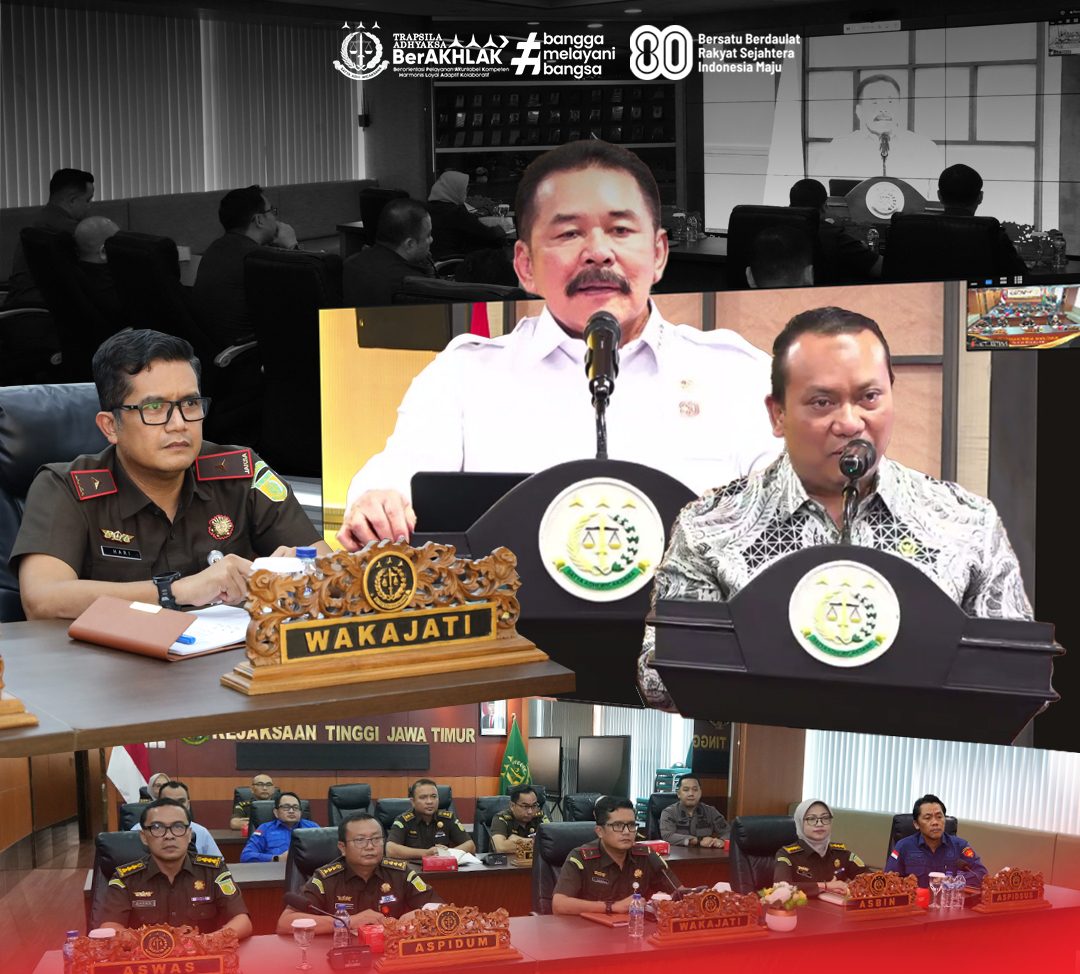 Kegiatan tersebut juga diikuti secara daring oleh seluruh jajaran Kejaksaan di Indonesia, termasuk Kejaksaan Tinggi Jawa Timur. Wakil Kepala Kejaksaan Tinggi Jawa Timur, Dr. Hari Wibowo, S.H., M., turut hadir secara virtual bersama Asisten Pembinaan, Asisten Tindak Pidana Umum, Asisten Tindak Pidana Khusus, Asisten Pengawasan, Koordinator, serta para Pejabat Eselon IV di Bidang Tindak Pidana Umum, bertempat di Ruang Rapat Lantai 3 Kejati Jatim.