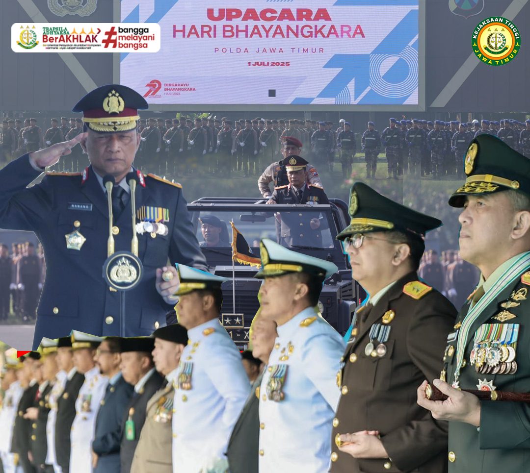 Surabaya — Kepala Kejaksaan Tinggi Jawa Timur, Dr. Kuntadi, menghadiri upacara peringatan Hari Bhayangkara ke-79 yang digelar di halaman Mapolda Jawa Timur, Jalan A. Yani No.116, Surabaya, pada Selasa (01/07/2025).