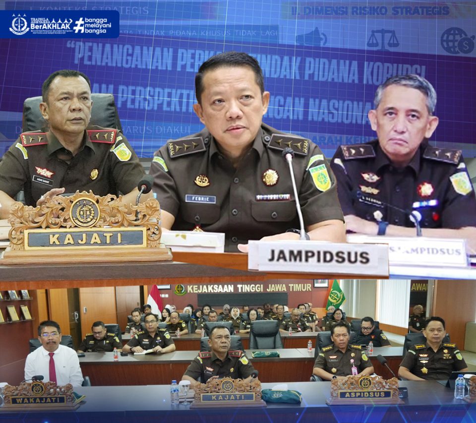 Surabaya — Kepala Kejaksaan Tinggi Jawa Timur, Agus Sahat S.T., S.H., M.H., didampingi Wakajati, Asisten Tindak Pidana Khusus, Asisten Pemulihan Aset, serta pejabat struktural dan jaksa fungsional pada Bidang Tindak Pidana Khusus, mengikuti kegiatan pengarahan virtual Jaksa Agung Muda Tindak Pidana Khusus (Jampidsus) yang dilaksanakan di Ruang Vicon Kejati Jatim, Kamis (2/4/2026).