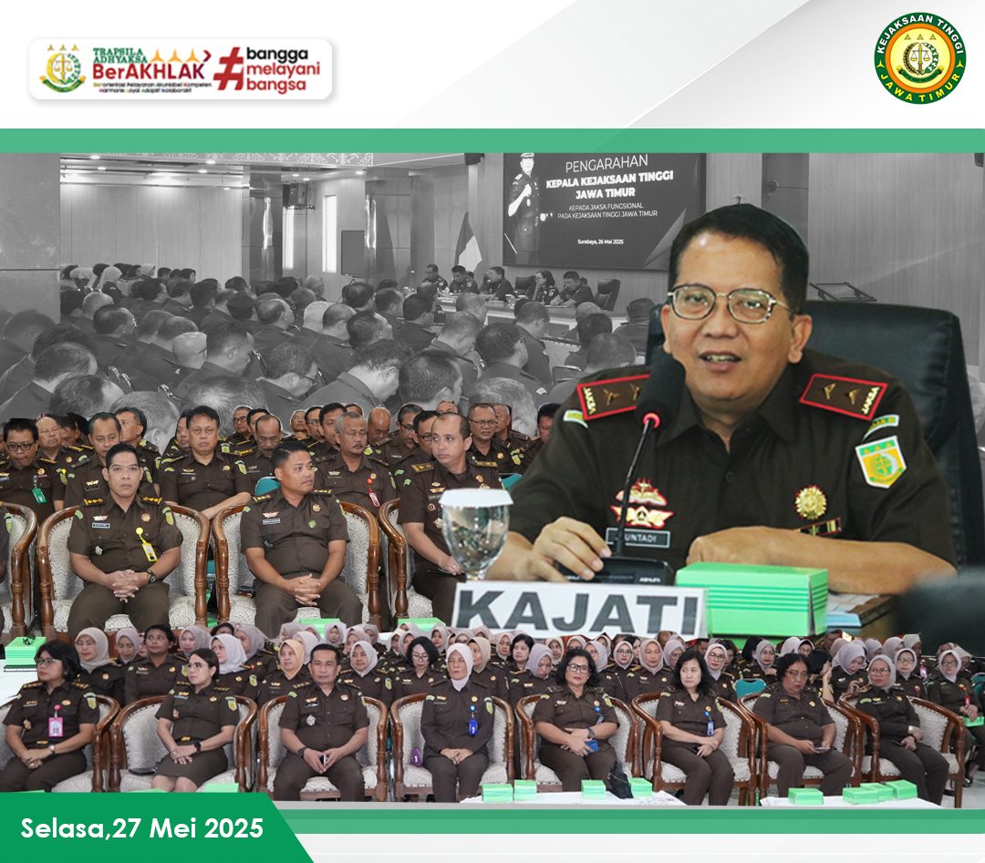 Surabaya – Bertempat di Aula Sasana Adhyaksa, Kepala Kejaksaan Tinggi (Kajati) Jawa Timur, Dr. Kuntadi, didampingi para asisten, memberikan pengarahan kepada jajaran Jaksa Fungsional serta para Kepala Seksi di lingkungan Kejati Jatim. Pengarahan ini difokuskan pada evaluasi hasil temuan dalam inspeksi umum pengawasan serta penegasan nilai-nilai dasar yang harus dijaga oleh setiap Insan Adhyaksa. Senin (26/05/2025)